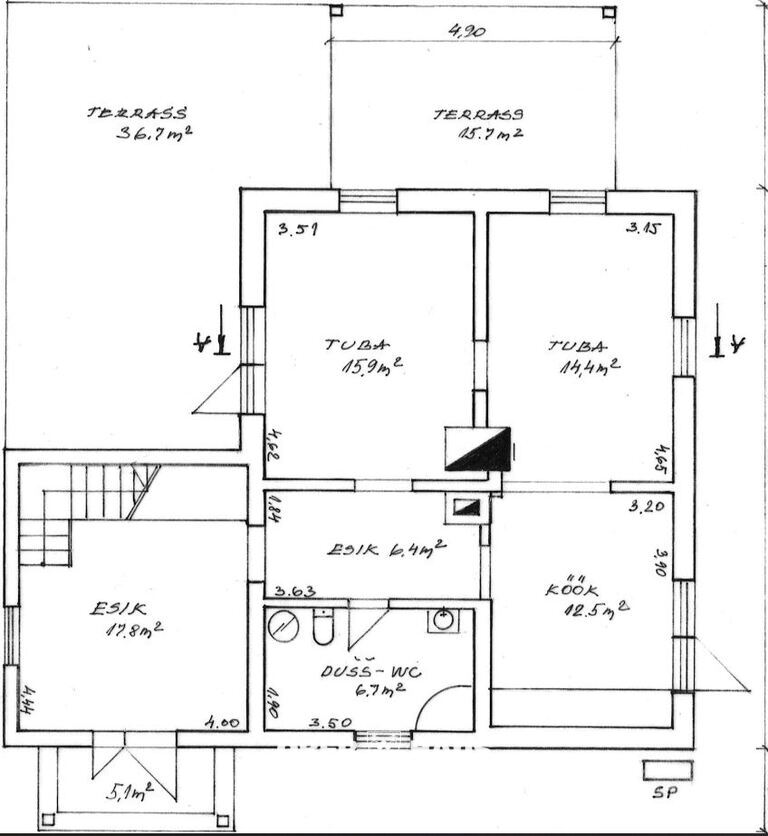 • Esimesel korrusel on avatud köök-söögituba, elutuba, vannituba, avar esik ja kaks väljapääsu suurele terrassile.
