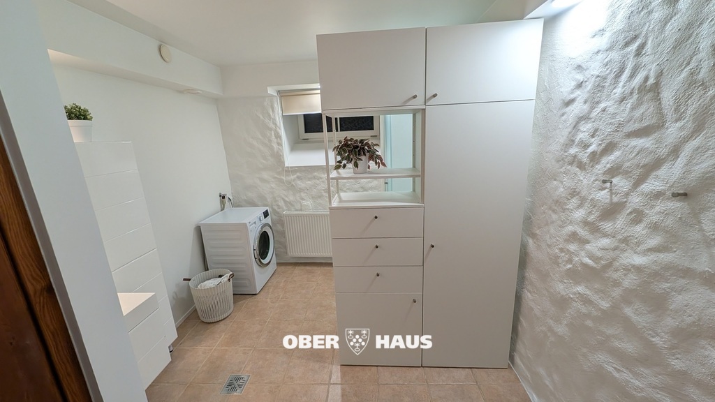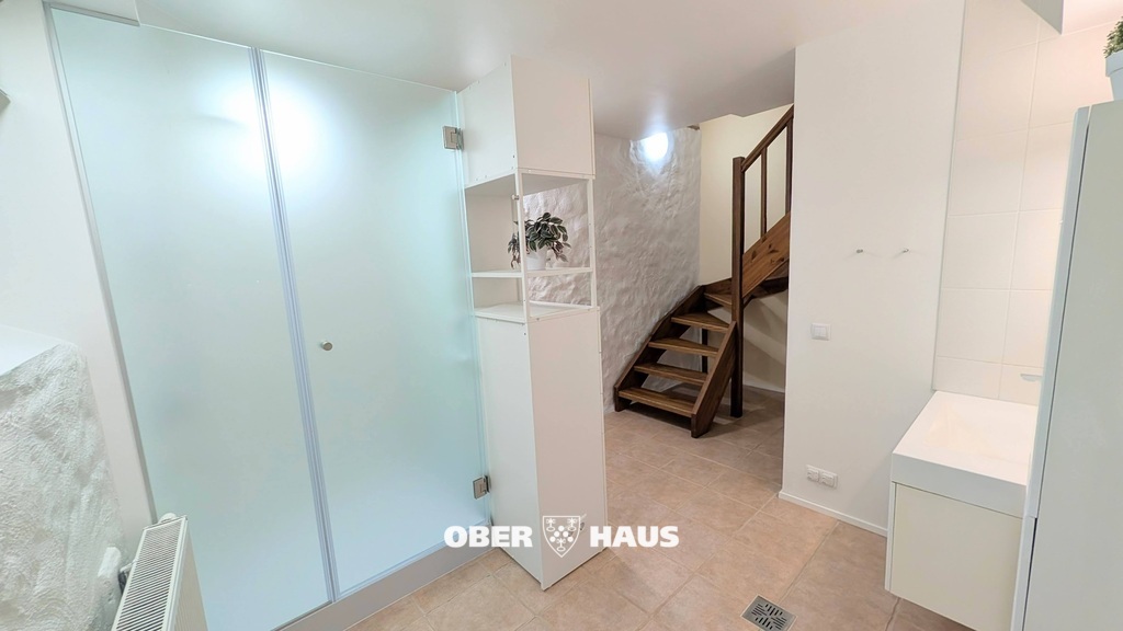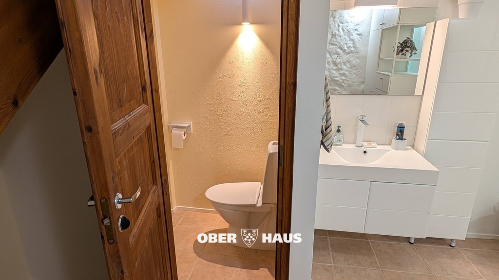 Trepist alla minnes vannituba ja eraldatud WC ning avar majapidamisruum (pesuruum/abiruum), kus on pesumasin ja kapid hoiustamiseks.